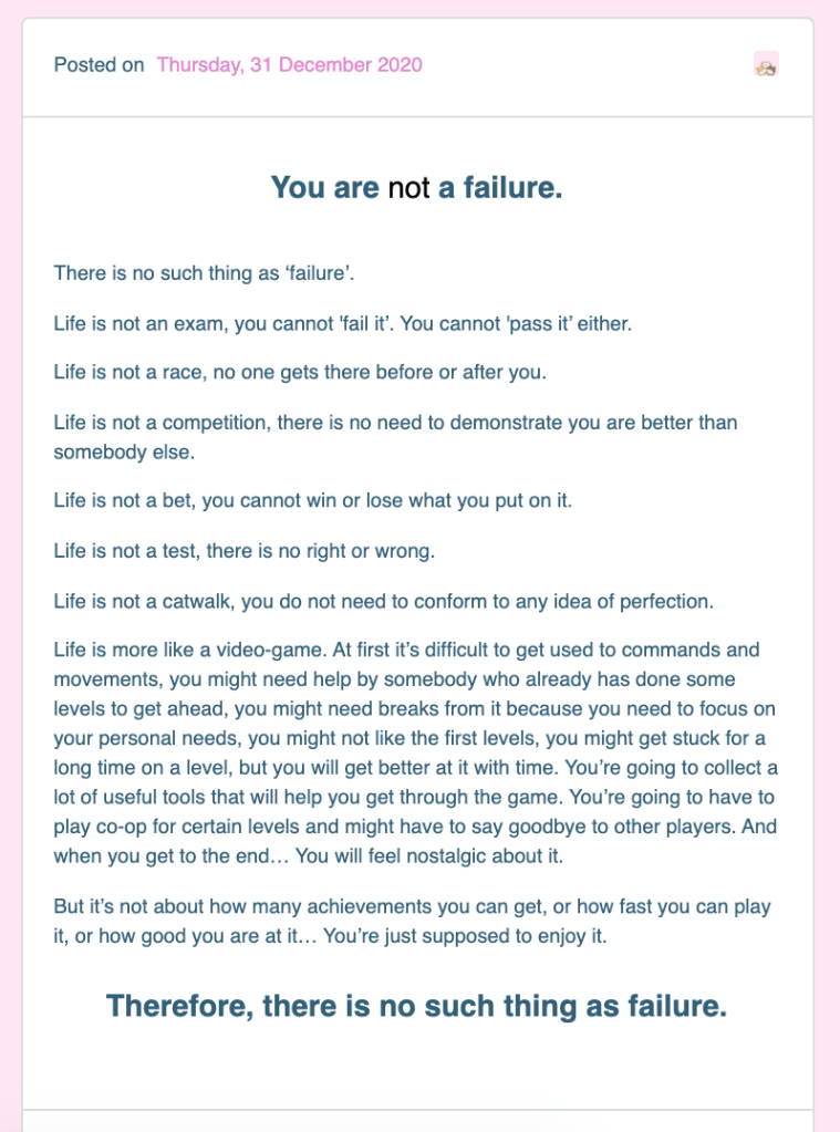 Atinycupofpositivitea is a Tumblr Blog about Mental Health and Positivity. Made in 2018 for personal use, it gained popularity during the pandemic and it is now counting over 6k followers. The content is made by Lizzy, an Italian content creator with a passion for languages, fitness and well-being. Linguist by day and blogger by night, what really drives her is the desire to help people struggling with mental health and give them the tools to deal with those issues in a healthy and safe way. The blog is also a proud ally of the LGBTQIA+ community, Feminism, the Black Lives Matter movement and Human Rights, including disability rights and all minorities rights.